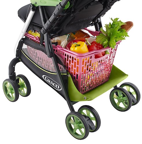 お店においてあるかごをベビーカーの下段にのせて、隙間からぽいぽい買うものを放り込めます。