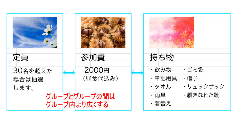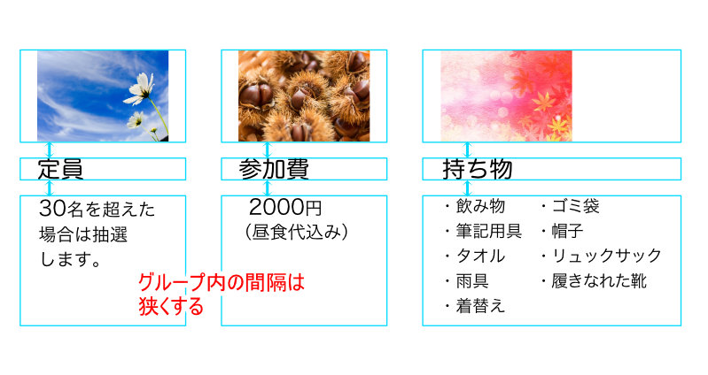 以上の原則どおりにすると、余白の大きさだけでグループが分かります。