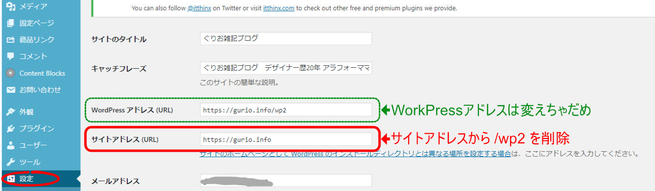 このとき、WordPressアドレスを間違えて変えないようにしましょう。