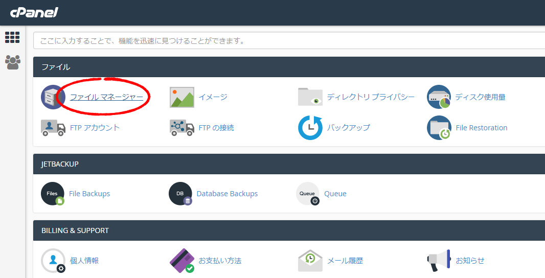 MixhostのCpanelから、ファイルマネージャー をクリックして入ります。