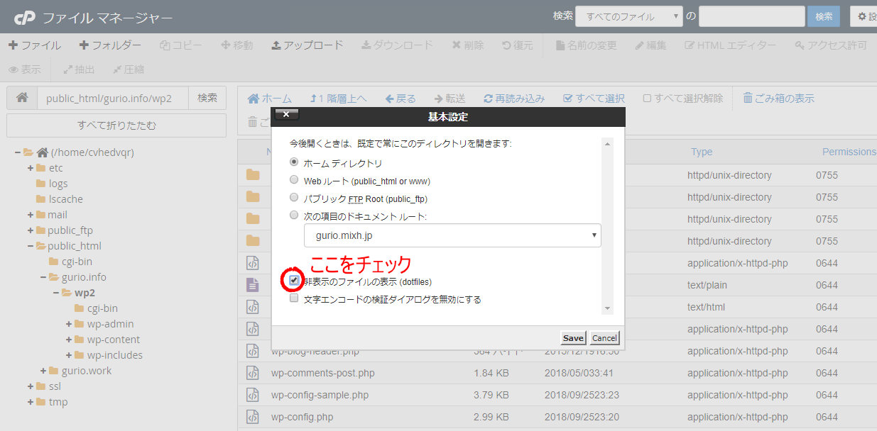 非表示のファイルを表示 にチェックを入れて、SAVEボタンを押します。
