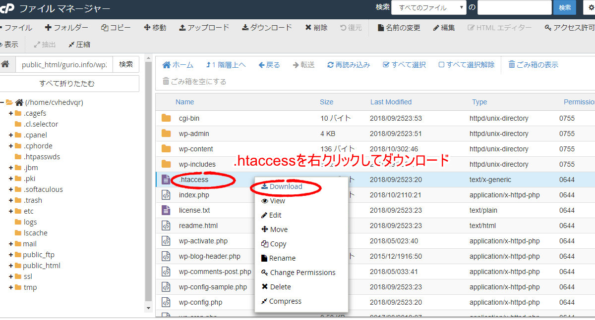 wp2の直下にある、.htaccess を右クリックして、パソコンの好きな場所にダウンロードします。