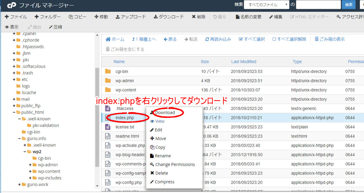 wp2の直下にある、index.php を右クリックして、パソコンの好きな場所にダウンロードします。