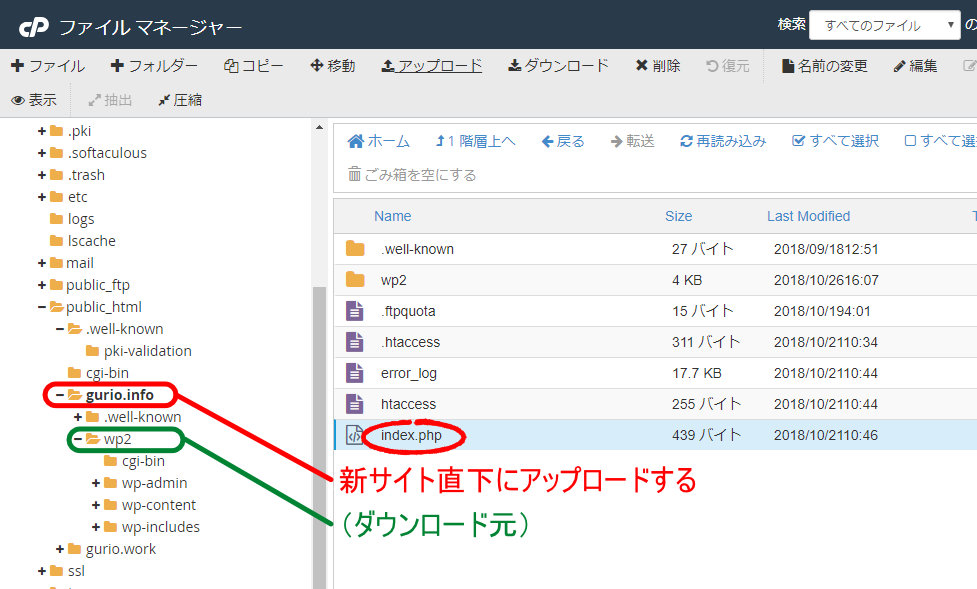 編集したindex.phpを、新しいサイトの直下にアップロードします。