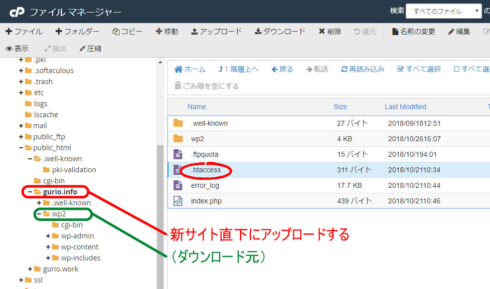 編集した.htaccessを、新しいサイトの直下にアップロードします。